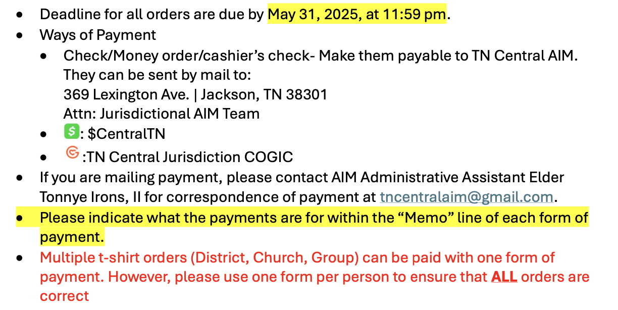 Check - Make all checks payable to: (Jurisdictional AIM Team)